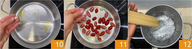 Place a pot filled with water on the stove, salted to taste, which will be used for cooking the pasta. Meanwhile, in a pan pour 2 teaspoons of oil and one clove of garlic 10. Let it flavor, then add the cherry tomatoes and salt 11. Cook them for about 5 minutes, slightly crushing them. Meanwhile, as soon as the water reaches a boil, add the linguine 12.