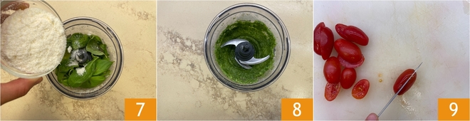 Also incorporate the grated pecorino cheese 7 and blend again until you obtain a cream 8. The pesto is ready, set it aside. Now move on to the cherry tomatoes: wash them and cut them in half 9.
