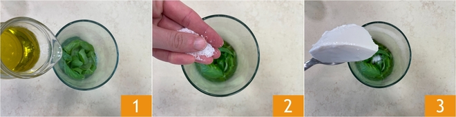 To prepare the pasta with pesto, mussels, and potatoes, start with the pesto: place the basil leaves, extra virgin olive oil 1, salt, and ricotta 2 in a bowl.