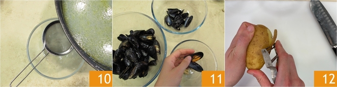 Drain the mussels and save the cooking liquid by filtering it with a colander 10, then shell them 11. Move on to the potatoes: peel them 12.
