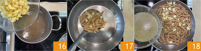 When there are 5 minutes left in the cooking time, add the potatoes 16. Drain everything together directly into a pan 17, then add the filtered mussel water and finish cooking the pasta 18.