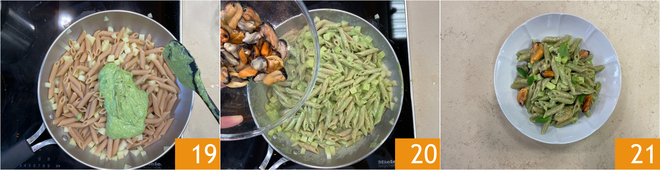 Turn off the heat, add the pesto 19 and mussels 20, then mix well. Serve your pasta with pesto, mussels, and potatoes, garnishing the dishes with a few fresh basil leaves 21!