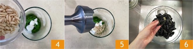 Add the pine nuts 4 and blend with an immersion blender 5 until you get a smooth mixture, then set aside. Take care of the mussels: rinse them under cold running water, remove the shell encrustations with a stiff brush or a steel wool pad, then pull off the byssus (the filament protruding from the side of the shell). Rinse them well and discard the broken or already open ones 6.
