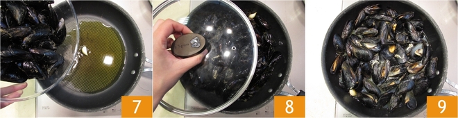 Heat some oil in a pan and add the mussels 7, then cover with a lid 8 and cook for about 5 minutes, until they have opened 9.
