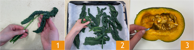To prepare the pasta with pumpkin cream and taleggio, start with the kale: separate the leaves from the stalks 1, then place them on a baking tray lined with parchment paper, spacing them slightly apart 2. Bake in a preheated convection oven at 340°F for 20 minutes. Meanwhile, take care of the pumpkin: clean it from seeds and internal filaments 3.