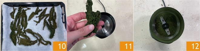 At this point, the kale will be cooked 10, and the leaves should be dry and crispy. Place them in a spice grinder 11 and grind to obtain a powder 12.