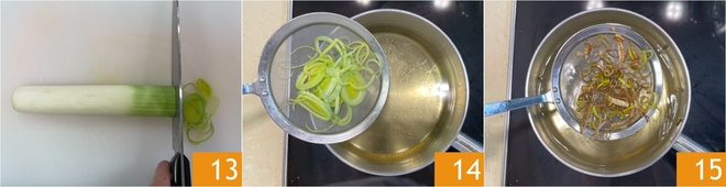 Move on to the leek: clean and finely slice the leek 13. Heat the vegetable oil to a temperature of 355°F and fry the leek rings 14 for about a minute, until golden. Drain 15 and transfer to absorbent paper or paper towels for fried foods.
