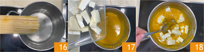 Now cook the spaghetti in salted boiling water 16. Meanwhile, heat the pumpkin cream in a saucepan, then add the diced taleggio 17 and stir over low heat to melt it completely 18.