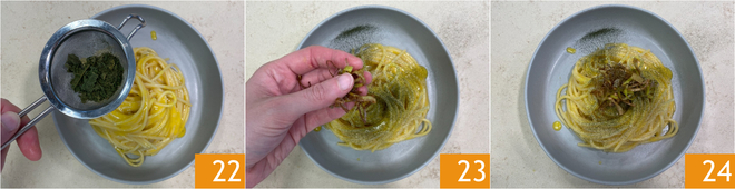 Plate and garnish with the kale powder, using a sieve 22, and the fried leek 23. Your pasta with pumpkin cream and taleggio is ready to be served 34!