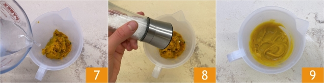 Transfer the flesh into a pitcher, then add the water 7 and salt 8. Blend with an immersion blender to obtain a smooth and homogeneous cream 9 and set aside.
