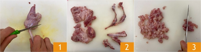 To prepare pasta with rabbit and cauliflower ragù, first debone the rabbit 1 and set aside the bones and scraps 2. Cut the meat into approximately 1/4 inch cubes 3.