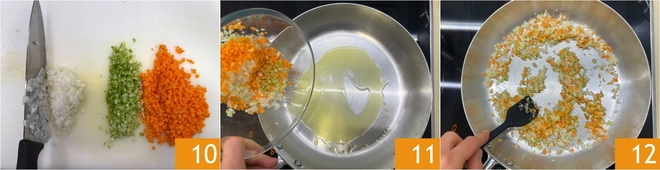 Meanwhile, prepare the soffritto for the ragù: finely dice the celery, carrot, and onion 10. Add a little oil to a pan, add the chopped vegetables 11, and salt immediately. Stew over low heat for about 10 minutes 12; the vegetables should be soft and translucent. Remove them from the pan and set aside.