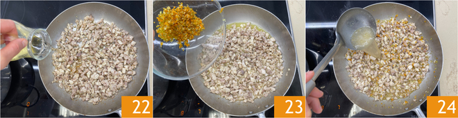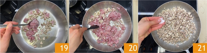 Set aside the reduction and take the pan in which you cooked the vegetables, clean it with a paper towel, and add another splash of oil. When it is hot, add the rabbit meat 19 and brown over medium heat for about 10 minutes 20, then salt 21.