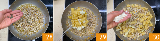 Once cooked, flavor the rabbit ragù with thyme leaves 28. Drain the pasta and cauliflower together and transfer them directly to the pan with the ragù 29. Sauté everything, then turn off the heat and add the grated cheese 30.