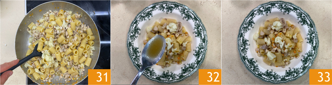 Mix well 31 and plate, finishing with the rabbit reduction 32 and more thyme as desired. Your pasta with rabbit and cauliflower ragù is ready to be served 33!