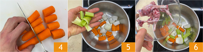 Temporarily set the meat aside and start with the reduction, beginning with the broth: coarsely chop the carrots 4, celery, and onion. Place the vegetables in a pot with a splash of oil 5 and toast them for a few minutes, then add the rabbit bones and scraps 6.