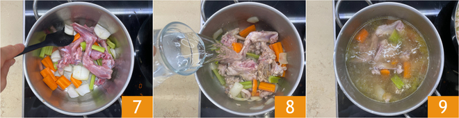 Continue to brown until well colored 7, then cover with cold water (or water and ice) 8 and let it simmer for about an hour 9.