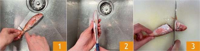 To prepare pasta with red mullet, capers, and black garlic, first clean the fish: scale the mullets by scraping the skin with the back of a knife 1, then cut off the fins and cut open the belly with a pair of scissors 2. Remove the guts and rinse well under running water. Now place the mullets on a cutting board and cut off the head 3.