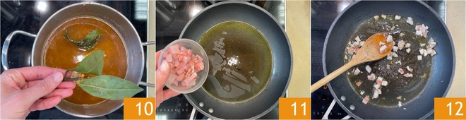 Add the bay leaves 10 and cook over high heat for about 30 minutes; the liquid should reduce by one third. Meanwhile, heat a drizzle of oil in a non-stick pan, add the mullet cubes 11 and sauté over medium heat for about 5 minutes. Once browned 12, remove them from the pan and set aside.