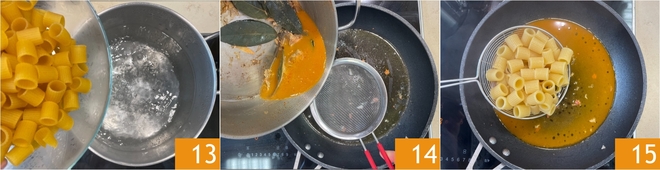 Meanwhile, bring a pot of salted water to a boil and cook the mezzi rigatoni 2 minutes less than the time indicated on the package 13. At this point, the fish broth will be ready, so strain it into the same pan where you browned the mullets 14. Drain the pasta and transfer it to the pan with the broth 15.