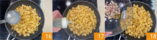 Add a ladleful of the pasta cooking water 16 and finish cooking it, then stir in some olive oil 17. Finally, add the browned mullet cubes 18.