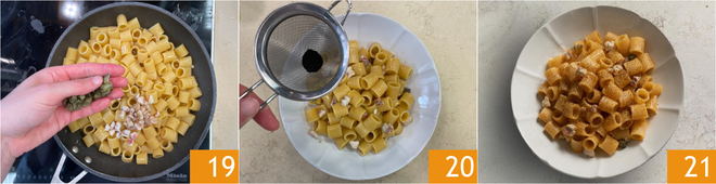 Also add the desalted capers 19 and stir everything together. Plate and finish with a sprinkle of powdered black garlic 20. Your pasta with red mullet, capers, and black garlic is ready to be served 21!