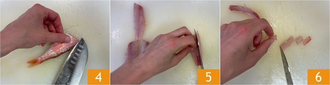 Extract the fillets 4 and separate them from the central bone 5. Remove the smaller bones from the fillets, then cut them into small cubes 6. Keep both the heads and the bones and store the mullet cubes in the refrigerator.