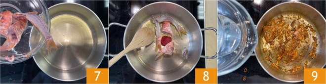 Heat a drizzle of oil in a pan, then add the red mullet scraps 7 and tomato paste 8. Sauté well over high heat, stirring often, then pour in the water 9 and deglaze the bottom of the pan.