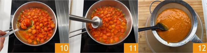 After the cooking time for the cherry tomatoes, turn off the heat and set aside some whole cherry tomatoes for plating 10. Blend the rest of the cherry tomatoes with an immersion blender 11, then sift the mixture through a fine-mesh sieve 12.