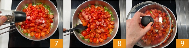 Salt and pepper 7, stir 8, and cook over medium heat with the lid on for about 10 minutes 9. In the meantime, cook the pasta in boiling salted water.