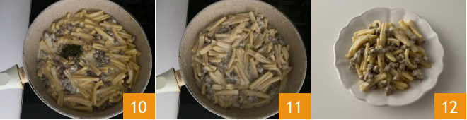 Flavor with chopped herbs (thyme, rosemary, and sage) 10, stir one last time 11, and serve the pasta with sausage and stracchino piping hot 12.