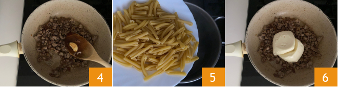 Continue cooking for another two minutes. Remove the garlic and keep warm 4. Cook the pasta for the time indicated on the package. Before draining the pasta, add the stracchino to the pan with the sausage 6.