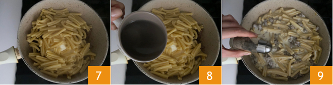Pour the pasta into the pan as well 7, add a little cooking water 8, and stir to combine and melt the cheese. Season with pepper to taste 9.