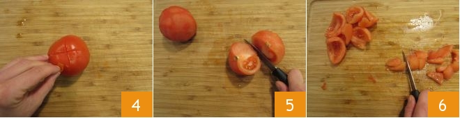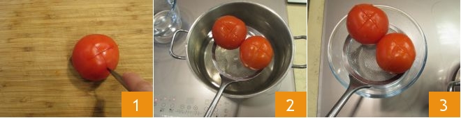 To prepare the pasta with sea urchins and tomatoes, first gently score the skin of the tomato to form a cross 1. Then blanch the tomatoes for a couple of minutes in boiling water 2, then drain them 3