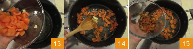 Sauté the chili pepper and garlic for a minute, then add the tomatoes 13 and cook for about another minute. Remove the garlic clove 14, add the sea urchin flesh, a ladle of the pasta cooking water, and toss for another 1-2 minutes at most. Turn off the heat.