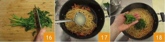 Meanwhile, chop the parsley 16 and when the pasta is still al dente, drain it and transfer it directly into the dressing. Add a little more cooking water 17, the chopped parsley, and the basil leaves 18.