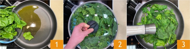 To prepare pasta with spinach cream and crispy guanciale, first, flavor the garlic clove with the oil in a large pan. Then add the spinach 1 and cover with a lid 2. Cook for about 5 minutes, then salt 3.