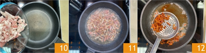 While the pasta is cooking, prepare the guanciale: cut it into strips, then place it in a hot pan 11. Cook over medium heat without adding any fats 11. Once it is well browned, drain it 12.