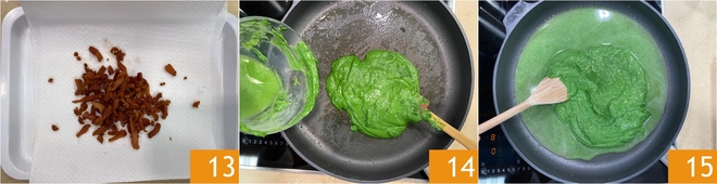 Transfer the guanciale to a tray with kitchen paper 13. Pour the spinach cream into the same pan you used for cooking the spinach 14. Add a ladle of pasta cooking water and stir to dilute it 15.