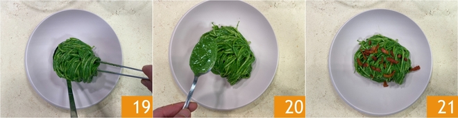 Drain the pasta al dente and transfer it directly to the sauce 16. If necessary, add another ladle of water 17 and toss everything well 18.