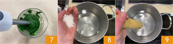 Blend with an immersion blender until you obtain a smooth and homogeneous cream 7. Set aside. Put a pot of water on the stove for cooking the pasta and salt it 8; as soon as it boils, drop in the spaghetti 9.