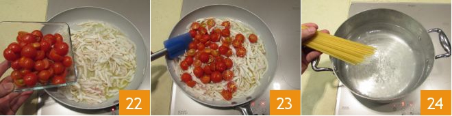 then add the cherry tomatoes 22, stir 23, salt and pepper, and cook for about 10 minutes. Meanwhile, bring salted water to a boil in a tall-edged pot and cook the linguine for about 8 minutes 34.