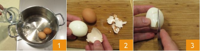 To prepare the pasta with squid and hard-boiled yolk, start by cooking the hard-boiled eggs. Fill a saucepan with plenty of cold water, immerse the eggs 1. From the moment it boils, count about 9 minutes (it also depends on the size of the eggs, we used medium eggs), the time needed to cook them. Then turn off the heat, pass the saucepan under fresh running water to cool them, and peel them 2. Score the egg white with a small knife 3,