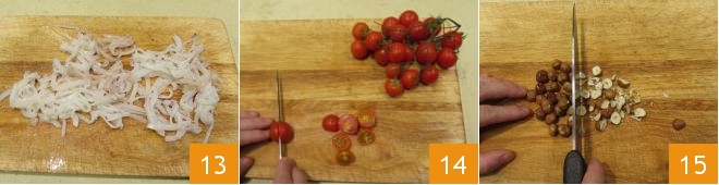 Once ready, set them aside 13; move on to the cherry tomatoes: cut them in half 14. Roughly chop the hazelnuts with a knife 15.