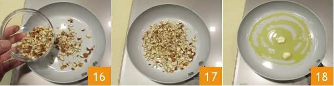 Pour the chopped hazelnuts into a pan 16 and toast them over moderate heat for a few minutes 17. Set aside the toasted hazelnuts and in the same pan heat the olive oil with the whole garlic cloves 18,