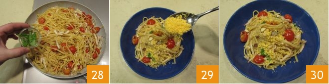 turn off the heat and add it to the pasta 28 to give fragrance to the dish. Stir and plate, then serve garnishing each plate with the crumbled yolk 29. The pasta with squid and hard-boiled yolk is ready to be enjoyed 30!