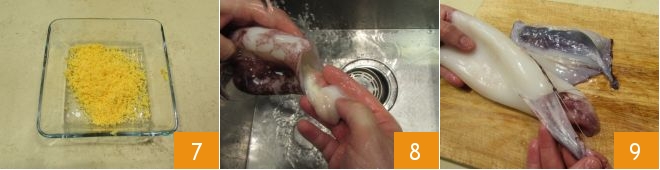 to obtain crumbs that you can set aside in a small bowl 7. Move on to cleaning the squid (we used a large squid, but you can use smaller squid, reaching the indicated weight). Rinse the squid under running water, then gently detach the head from the mantle with your hands, remove the innards 8. Remove the outer skin: score the end of the mantle with a small knife, just enough to grab an edge of the skin and completely pull off the covering with your hands 9.
