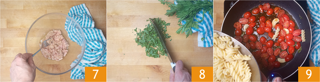 Transfer the tuna to a bowl and crumble it with a fork 7. Then chop the parsley 8 and tear the basil leaves by hand. Once the pasta is cooked, drain it and transfer it to the pan with the cherry tomatoes 9.