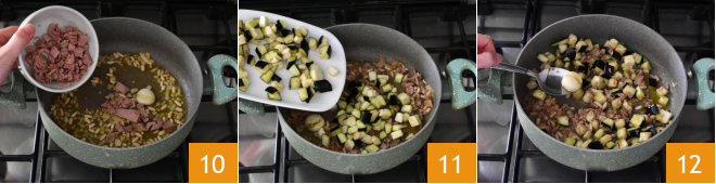 and finally add the tuna letting it flavor for about another minute 10. At this point, you can add the well-rinsed and drained eggplants 11 and let them cook for 5-10 minutes. Remove the garlic 12,
