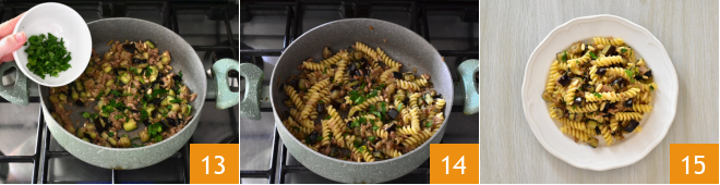 add the parsley 13 and drain the pasta directly into the sauce 14. A quick toss and you can finally plate your tuna and eggplant pasta 15.